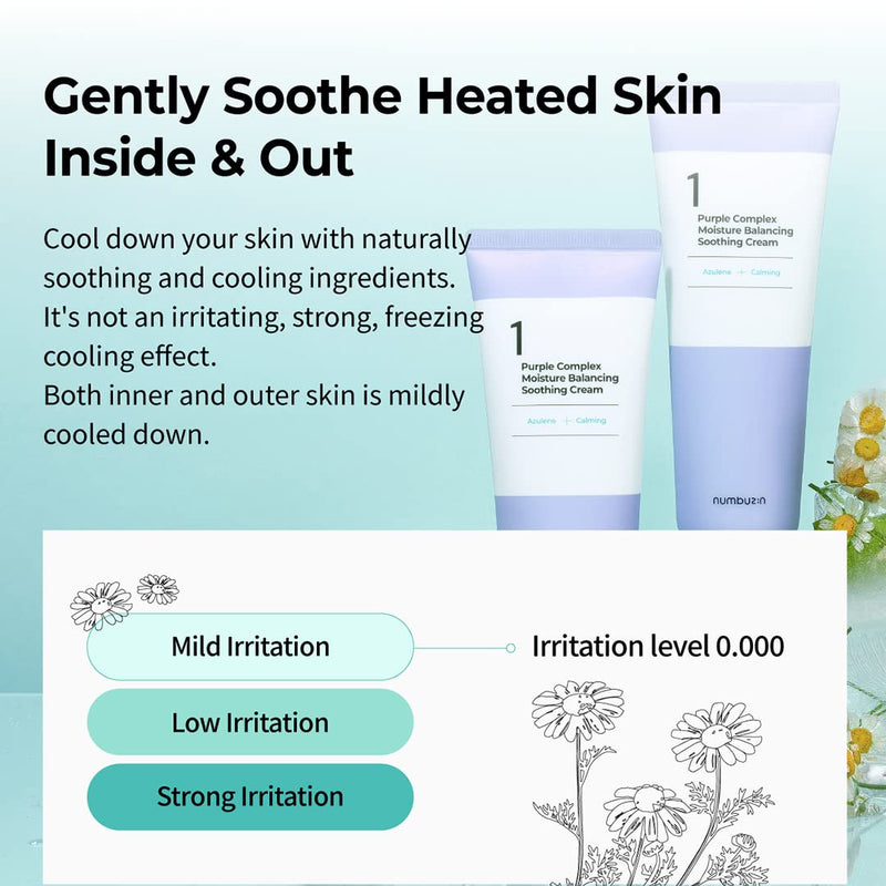 DESCRIPTION Numbuzin No.1 Purple Complex Moisture Balancing Soothing Cream instantly soothes irritated skin and replenishes moisture levels. Soothing powers of numbuzin's Purple Complex (a mix of purple carrot, red cabbage, eggplant, beet and blueberry extracts as well as azulene) Additional ingredients of triple hyaluronic acids and.